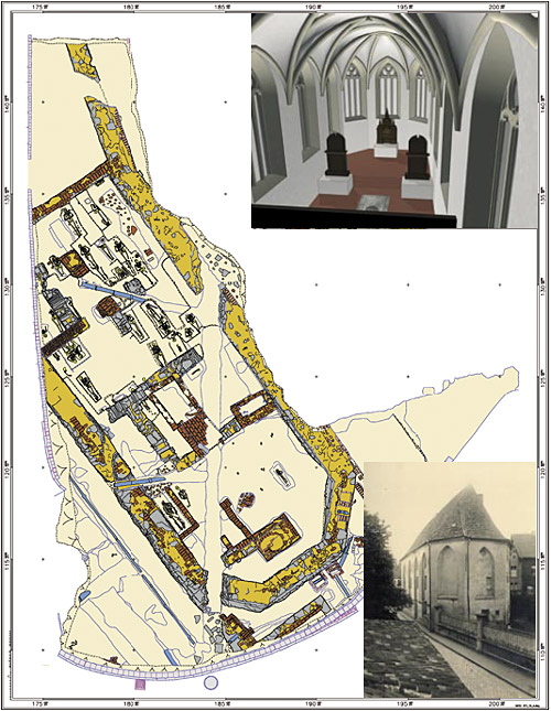 Gleich zu Beginn der Grabungskampagne von 1999 wurden die Kirche und ein Teil der anschließenden Klostergebäude freigelegt. Die Kirche war nord-west-südost gerichtet, sie besaß einen polygonalen Chor und war außen 11,60 m breit und 25,40 m lang. Im Inneren fanden sich die Rippen der Deckeneinwölbung und die Maßwerke der Kirchenfenster wieder. Sie waren bei den Umbauarbeiten 1824 herausgeschlagen und für Fundamentierungen von Zwischenwänden genutzt worden.
