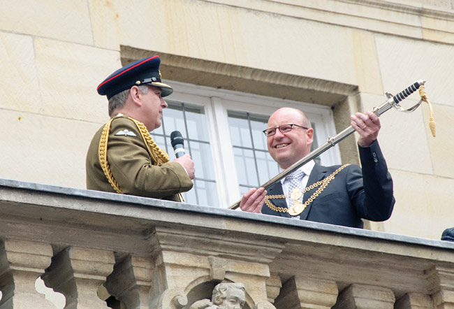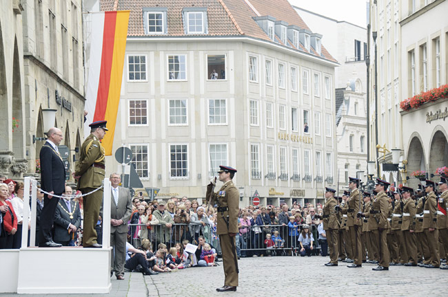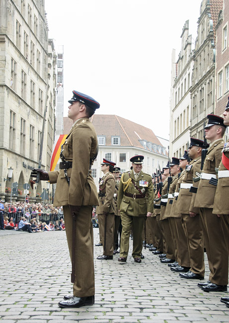 Für Münster ging ein fast sieben Jahrzehnte währendes Kapitel Stadtgeschichte zu Ende: Bei einer Parade auf dem Prinzipalmarkt verabschiedeten Oberbürgermeister Markus Lewe und Prinz Andrew die letzten britischen Soldaten.