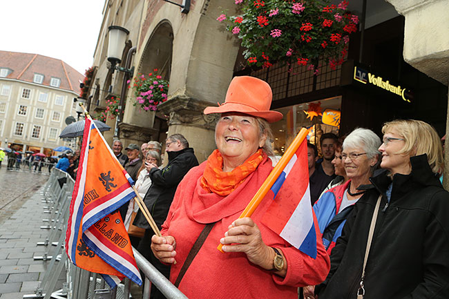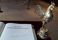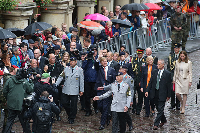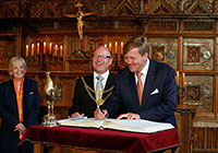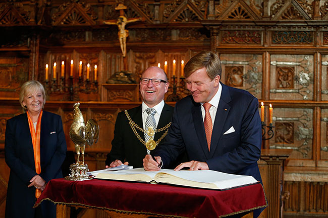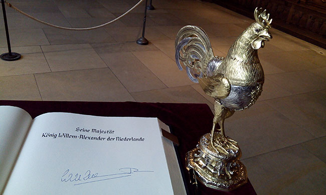 Zuvor trug sich der niederländische König bei einem Empfang bei Oberbürgermeister Markus Lewe in das Goldene Buch der Stadt ein und nahm den traditionellen Schluck aus dem Goldenen Hahn.
