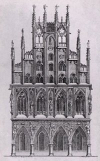 (Fabio Chigi) Neben den vielen Kirchen stachen die repräsentativen öffentlichen Profanbauten der Bürgerinnen und Bürger aus dem Stadtbild Münsters hervor und fanden bei den Gesandten und Besucherinnen und Besuchern Münsters anerkennendes Lob. Sie fielen durch ihre verzierten Giebel auf und waren Ausdruck der Macht und des Selbstbewußtseins der nach Autonomie strebenden Bürgerschaft, die sich seit Anfang des 13. Jahrhunderts entwickelten. Das bürgerliche Selbstbewußtsein fand seinen architektonischen Niederschlag im vor Mitte des 13. Jahrhunderts erbauten und seit 1250 als "Borgerehues" (Bürgerhaus) genutzten gotischen Rathaus, im 1525 erbauten Versammlungshaus der Gesamtgilde, dem Schohaus auf dem Alten Fischmarkt, und im 1589 am Alten Steinweg fertiggestellten Krameramtshaus, dem Amtshaus der Kramergilde. Das Selbstverständnis und Selbstbewußtsein der Stadtgesellschaft im konfessionellen Zeitalter brachten besonders die Neugestaltung der Ratskammer in den Jahren 1576 und 1577 sowie der Bau des Krameramtshauses zum Ausdruck. | ||||