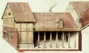 (Fabio Chigi) Das in Eichenfachwerk ausgeführte Bürgerhaus war ein in Münster weit verbreiteter Haustyp, der den Typ des westfälischen Bauernhauses, städtischen Verhältnissen angepaßt, wiedergab, wenn Tenne und Stallungen zu entbehren waren. Der Haustyp konnte je nach Nutzungsbedarf (Wohnung, Stall, Werkstatt, Warenlager) variiert werden und war besonders in der Stadtperipherie zu finden. Das Bürgerhaus der Zeichnung besteht aus drei Teilen. Links an der Straßenseite befindet sich das zweistöckige Vorderhaus aus Fachwerk mit zentralem zweiflügeligem Haustor. Neben dem Tor ist ein Fenster als "Feiltür" geöffnet; hier konnten auf dem heruntergeklappten Fenster Waren zum Verkauf "feilgeboten" werden. Rechts in der Zeichnung befindet sich das Hinterhaus, das durch ein Dach, das von einer Rückwand und einer Balkenreihe gestützt wird, mit dem Vorderhaus verbunden ist. Das Hinterhaus stand meistens über einem Keller in dem die bewegliche Habe des Hausstandes untergebracht, sowie Lebensmittel oder Waren gelagert wurde. Seit dem Spätmittelalter war es auch üblich, beide Häuser direkt zu verbinden. | ||||