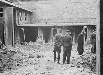 "Die Rückseite von Haus Doorn nach dem Bombenabwurf. Im Vordergrund einer der zwei Trichter von den sechs Bomben."