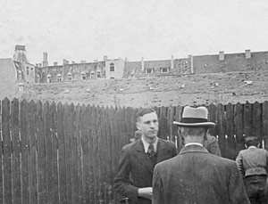 "Neugierige, die wegen der Straßensperrung durch die Lattenzäune am Hafenweg einen Blick auf die demolierten Dächer tun möchten. Im Hintergrund die Häuser der Hafenstraße."