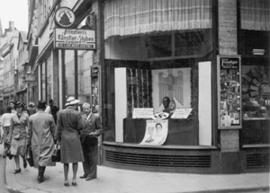"Das europäische Siegeszeichen V, das Viktoria bedeutet, hat auch in der Propaganda in Münster Eingang gefunden, besonders vor zugenagelten oder mit Pappkarton geschlossenen Schaukästen. Hier ist das Siegeszeichen von der Firma Nolte von der Horst-Wessel-Strasse angebracht."