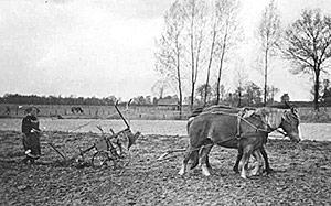 "Die Frau des Bauern führt selbst den Pflug, da ihr Mann auf Nachbarhöfen in der Bauerschaft Holhorst helfen muss, wo die Männer und Söhne eingezogen sind."