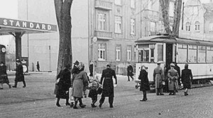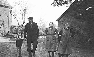 "Die Evakuierten aus dem Hause Münstermann auf dem Wege zur Straßenbahn. Gott sei Dank, sagen sie, wir sind in Havixbeck untergekommen."