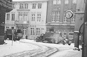 Lastwagen mit Flakgeschützen fahren an der Ecke Königstraße / Rothenburg entlang.