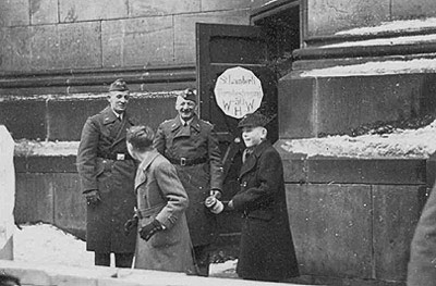 Wehrmachtssoldaten beladen Lastwagen mit Tischen und Stühlen, die im Prinzipalmarkt vor den Geschäften Kluxen und A. Spanke stehen.