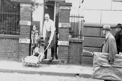 "Fotos von der beginnenden Evakuierung in Münster. Die Sorge, daß dem Angriff in der Nacht noch ein Tagesangriff und ein neuer Nachtangriff folgt, veranlaßt viele Familien, ihre Kinder schon morgens auf den Weg in die Nachbardörfer zu bringen, wie hier die Familie eines Kaufmanns auf der Neustraße."