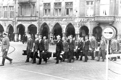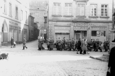 "Mitte April rücken sehr viele Soldaten von Münster aus. Oft begegnet man in Richtung Bahnhof vorbeimarschierenden Trupps, wie hier auf dem Spiekerhof, als gerade der alte Horstebergaufgang von der Kamera festgehalten werden sollte."