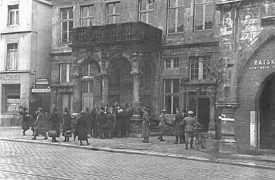 Vor dem Stadtweinhaus steht eine große Anzahl von Trauernden, die an einer Trauerfeier für Bombenopfer teilnehmen.