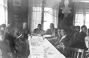"Sobald die ersten den Anfang gemacht haben und am entgegengesetzten Ende des Saales die Tische besetzt sind, dauert es nicht lange, bis sich der ganze Saal gefüllt hat. - Als der packende Vortrag des alten Parteigenossen zu Ende ist, sind alle um einige Grad mehr davon überzeugt, daß wir in diesem Krieg bis zum äußersten durchhalten müssen und auch durchhalten werden."