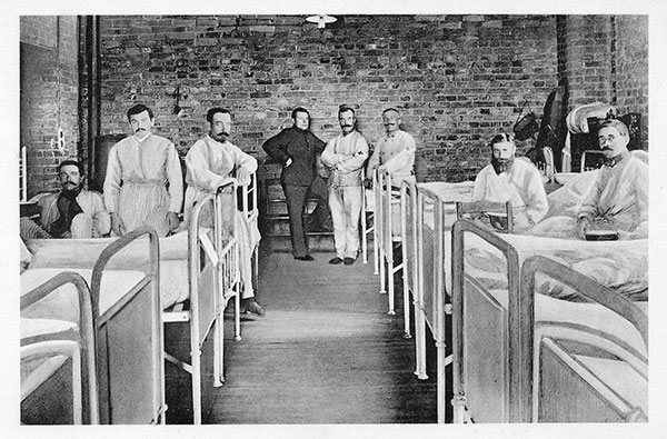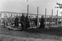 'Ihre Unterbringung [der französischen Kriegsgefangenen] ist vorläufig noch mit großen Schwierigkeiten verbunden. Zum Schutze gegen den ständigen Regen wurden zunächst ganze Reihen schräger Holzgerippe aufgerichtet und mit wasserdichten Plantüchern bespannt. In diesen langen Gassen liegen die Gefangenen auf Stroh ziemlich geschützt. Aus Brettern, Balken und Plaggen bauen sich viele selbst warme Erdhütten in der Art von Unterständen. Die Gefangenenstadt soll aus 3 großen Blocks von Holzbaracken bestehen, die im Viereck zusammengebaut werden und deren Fußböden auf Balken etwa 30 cm über dem Erdboden zu liegen kommen. Mitten in jedem der drei von den Wohnbaracken gebildeten Krals werden die Wirtschaftshäuser mit Küche, Wäscherei und Baderaum angelegt. Im ganzen Lager sollen die Wege mit Schwellen befestigt werden. Für die Zukunft werden technische Einrichtungen getroffen, um die zahlreichen Abwässer, Grundwasser und das Regenwasser abzuleiten. Tag für Tag herrscht dort ein ungewohntes Leben und Treiben bunt zusammengewürfelter fremder Nationen. Die Gefangenen riefen sofort ein fast fieberhaftes Interesse bei vielen Einwohnern hervor. Durch Sturm und Regen wandern schon seit Sonntag hunderte den durchweichten Weg zum Haus Spital, um die zum Teil sehr ungepflegt aussehenden Franzosen anzustarren und sich von den hochmütigen Engländern überlegen betrachten zu lassen. Unreife Burschen reichten den Gefangenen durch das Drahtgitter Zigaretten, versuchten mit ihnen ein paar französische oder englische Wörter zu radebrechen und hielten das ungewohnte Bild auf der photographischen Platte fest.'
