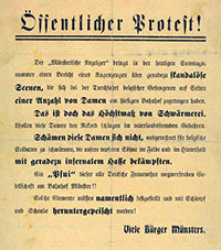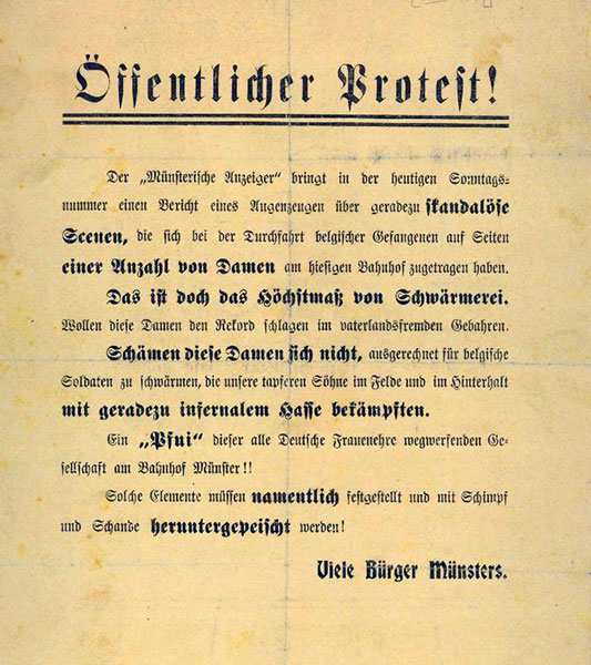 'Eine widerliche Szene spielte sich heute abend auf der Ägidiistraße ab. Als gegen 7 Uhr ein Trupp gefangener Franzosen von den Barackenbauten auf der Rennbahn zum Gefangenlager Haus Spital zurückgeführt wurde, scharte sich in der Nähe der Ägidiikaserne eine große Menge zusammen, die die Gefangenen mit Johlen und Rufen empfing und begleitete.'