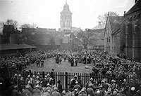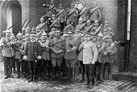 'Das Landsturm-Bataillon Münster II rückte nachmittags feldmarschmäßig gekleidet ins Feld. Ohne Rücksicht auf den eisigen, flackernden Wind harrten die Angehörigen und andere Zuschauer fast eine Stunde auf dem Roggenmarkt und an der Neubrückenstraße auf den Abmarsch der 1000 Mannschaften. Die erwachsenen Zuschauer waren recht ernst gestimmt, so daß nur die Kinder sich an den Liedern der Soldaten beteiligten. Es war, als wenn mancher in jedem Soldaten einen Todeskandidaten sähe.'