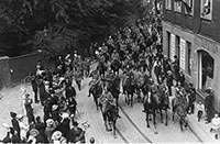 'Zu einer machtvollen Kundgebung gestaltete sich heute Vormittag der Abschied unserer Dreizehner. […] Während das Pflaster von dem eisernen Marsch erbebte und die Bürger den Truppen begeistert zujubelten und zuwinkten, spielte die Regimentskapelle auf dem Michaelisplatz mit rauschender Musik vaterländische Lieder, die von Soldaten und Bürgern stürmisch mitgesungen wurden.'
