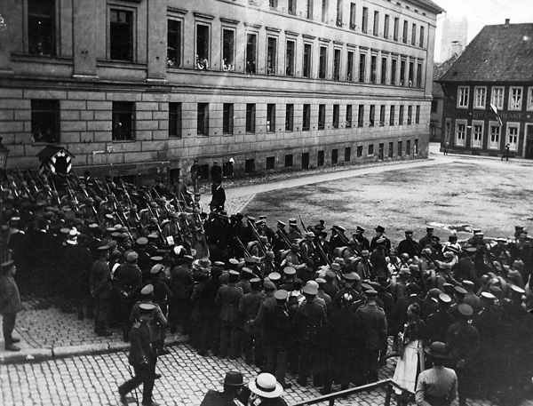 'In den letzten Tagen ist das militärische Straßenleben noch reger geworden. Große Trupps Landstürmer, altgediente Leute von 39-45 Jahren, manche schon mit grauem Haar, ziehen täglich vom Bahnhof durch die Stadt zu ihren Gestellungsplätzen. Auch viele Rekruten, Ersatzreservisten und unausgebildete Landstürmer von 20-22 Jahren füllen die Kasernen.'