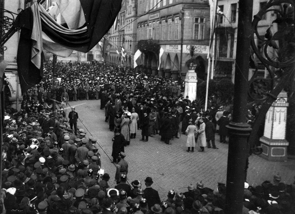 'Bei stärkster Teilnahme der Bürgerschaft, die sich auf dem festlich beflaggten Prinzipalmarkt zu Tausenden einfand, gestaltete sich die Einweihung [des Kriegswahrzeichens der Kreise Münster-Stadt und Land] zu einer weihevollen Feier. […] Den ersten Nagel schlug der Kommandierende General ein. […] Das Kriegswahrzeichen ist 3,50 Meter hoch, besteht aus Wildmahagoniholz und ist von dem hiesigen Bildhauer Heinrich Bäumer, von dem die Ausführung des Lambertusbrunnens herrührt, angefertigt. […] Der Sockel trägt an den Seiten die Wappen der Stadt und der Provinz, sowie an der Vorderseite die Inschrift: Ihr wollt uns vernichten? / Ihr glaubt uns in Not? / Nur ´ran denn! – Es gilt! / Sieg oder Tod! Ein eiserner Nagel kostet 1 Mark, ein silberner 5 Mark und ein goldener 20 Mark. Bei Spenden von mindestens 100 Mark werden am Sockel Eisenschilder mit dem Namen der Person, Firma, Gesellschaft oder Korporation angebracht.'