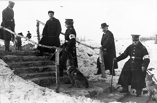 'Für die Zwecke des Deutschen Vereins für Sanitätshunde begann auch hier der Hausverkauf von Wohlfahrtspostkarten mit Bildern von Hindenburg und Ludendorff, seines Generalstabschefs. Der Verein hat der Heeresverwaltung bisher 1.678 Hunde und 1.612 Führer zur Verfügung gestellt, davon die Ortsgruppe Münster 48 Führer und Hunde.'