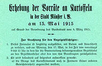 Schon im Januar 1915 beginnen Rationierungen von Lebensmitteln. Seit 8. März werden Ausweiskarten, die als Berechtigungsscheine für den Erhalt von Brotmarken gelten, und Haushaltungskarten ausgegeben, auf denen die Anzahl der im Haushalt lebenden Personen vermerkt waren. Die erste Ausgabe von Brotmarken erfolgt am 13. März 1915, die zwei Wochen gültig sind. Vom 8. bis 21. Oktober 1915 sind 88.397 Personen in Münster versorgungsberechtigt. Mehrere Volkszählungen und Personenbestandsaufnahmen dienen der Ermittlun der Zahl der Berechtigten.