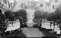 'Unter starker Beteiligung der Bürgerschaft fand die Große Prozession statt. Hinter Magistrat und Stadtverordneten schritten etwa 400 Verwundete aus den hiesigen Lazaretten. Wie im Vorjahre waren an der Clemenskirche und auf dem Platz beim Kiepenkerl-Denkmal auf den Krieg bezügliche Gruppen aufgestellt; hier thronte inmitten von Blattpflanzen und Blumen eine Christusfigur; dreißig Engelchen trugen folgende, die Wünsche der ganzen Welt enthaltende Bittschrift die Stufen empor: