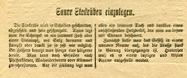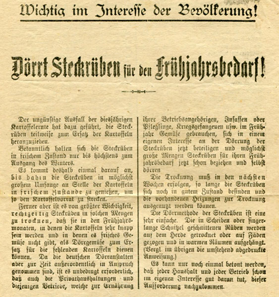'Wie wir an der Erhaltung unserer Steckrübenvorräte mithelfen können, das sagte die Presse uns durch einen besonderen Aufsatz über das Dörren, das Einkochen und das Einsäuern dieses nunmehr so wichtigen Nahrungsmittels. Flugblätter und Broschüren beschäftigen sich ebenfalls mit diesem sonst so stiefmütterlich geliebten Gemüse oder Futter.'