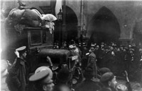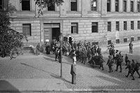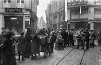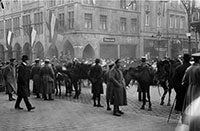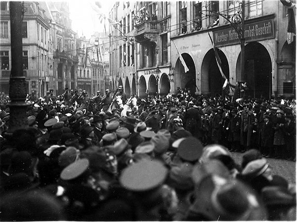 'Unter jubelnden Zurufen, Tücherschwenken und Hütewinken zog am Nachmittag um 4 Uhr mit Musik, Gesang und wehenden Fahnen in den sächsischen Landesfarben das Schützenregiment Nr. 108 über den Prinzipalmarkt als erster größerer Truppenteil, der auf dem Marsche zur Demobilmachung Münster berührte.'