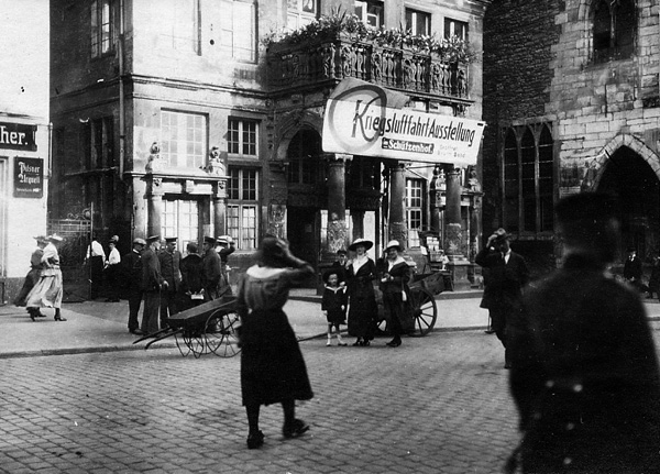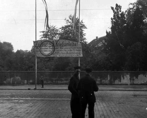 'Um das Gebiet der Fliegerei dem Verständnis der Bevölkerung zu erschließen, veranstalten der Deutsche Luftflotten-Verein und der Deutsche Fliegerbund bis zum 18. August im Schützenhof eine Kriegsluftfahrtausstellung. Die verschiedenen Bauweisen, auch Großkampfflugzeuge, Kampfeinsitzer und feindliche Flugzeuge wurden gezeigt. Den zahlreichen Besuchern wurde auch Funkentelegraphie vorgeführt.'