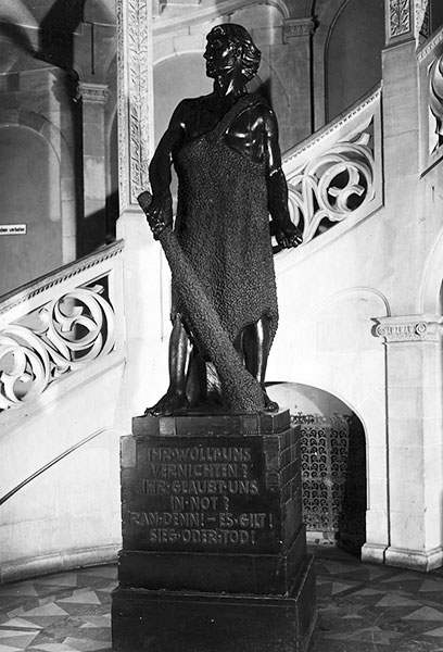 'Nachdem der 'Junggermane' seit dem 21. Oktober 1915 als Kriegswahrzeichen zum Besten der Hinterbliebenen in Münster-Stadt und Land vor dem Sentenzbogen gestanden hat, brachte ihm am heutigen Mittag die Jugendwehr mit Trommeln und Pfeifen, schwungvoller Rede und klingendem Spiel der Regimentskapelle feierlich die letzte Huldigung dar. Am folgenden Morgen wurde er abgebaut und im Treppenhause des Stadthauses aufgestellt.'