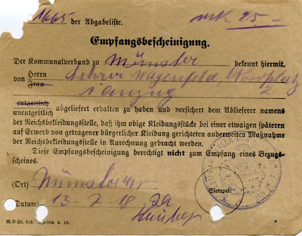 'Zur Bekleidung der Heimarmee hat unsere Stadt 4.054 Anzüge aufzubringen. Hiervon sind bisher erst 1.815 Stück eingegangen, so daß noch über 2.000 abzuliefern sind. Die Reichsbekleidungsstelle hat zwar die Frist zur Ablieferung bis zum 15. August verlängert, hat aber keinen Zweifel darüber gelassen, daß die auferlegte Anzahl von Kleidungsstücken aufgebracht werden muß. Der Magistrat fordert zu reichlicherer Ablieferung von Männeroberkleidung auf.'