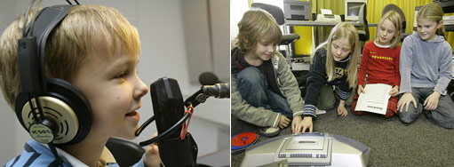 Einen Vormittag lang hatten die Kinder das Studio der VHS für sich, begleitet von der Studioleiterin Christine Bertels. Sie machten sich mit der Technik am Schnittcomputer und am Mischpult vertraut, lernten ins Mikrofon zu sprechen, Musik anzusagen und aus mitgebrachten O-Tönen eine Reportage zu bauen. Denn Material für die Sendung hatten die Kinder bereits recherchiert. Die Klasse 3b hatte im Kinder- und Jugendtheater die „Die Zauberflöte“ gesehen und gestaltete für die Radiosendung darüber einen Bericht. Aus dem Besuch hinter den Kulissen der städtischen Bühnen wurde eine Theaterreportage.